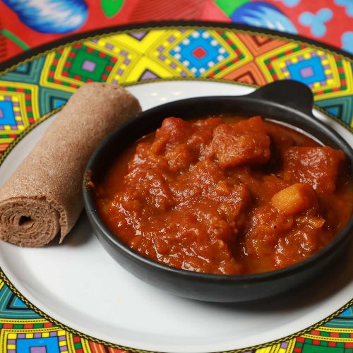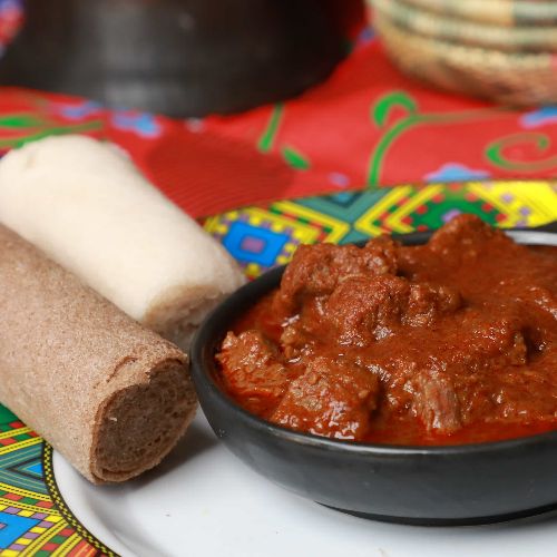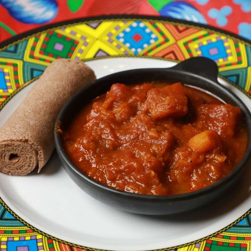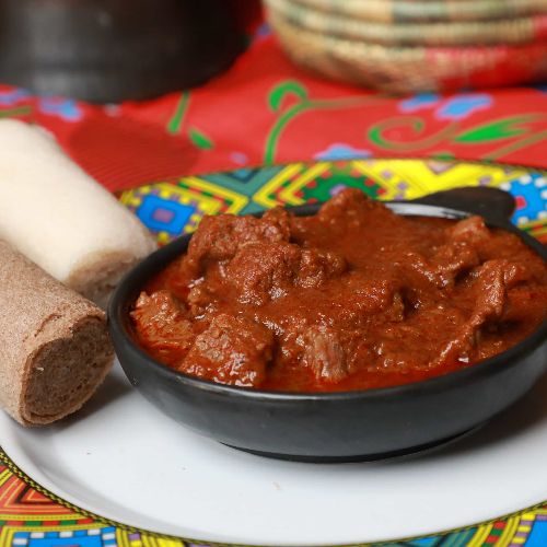 Beef fillet / Lamb cut into cubes, stir-fried and mildly spiced with Berbere (a fiery Ethiopian spice blend) as well as Kibe (Ethiopian spiced butter) - a delectable Ethiopian staple.