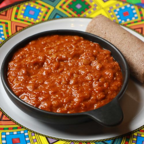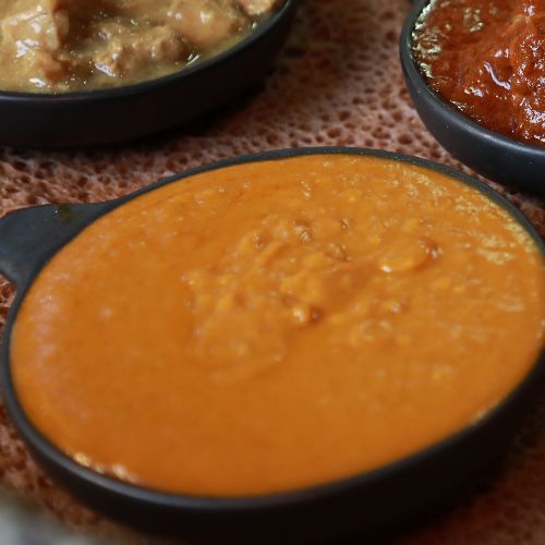 Split red lentils sautéed with onions and garlic slow-cooked with Berbere (a fiery Ethiopian spice blend) for a mild spice.