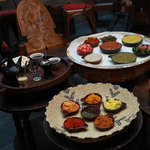 The perfect course for romantic meals, group events or functions. Includes a starter and a preselection of six different main dishes and three side dishes to share. Choose between a selection of Non-vegan or Mix. This is then followed by dessert and an Ethiopian-style coffee, served according to ancient ceremonial tradition.