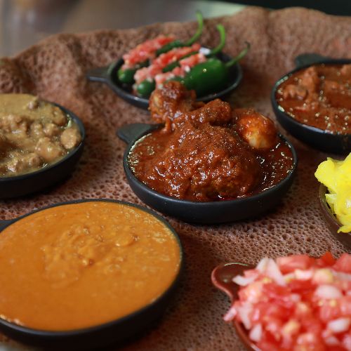 Try our carefully selected platter menu with a variety of five main course dishes. Kai Sega Wot, Doro Alicha, Pumpkin Alicha, Misir Wot, Kek Alicha, & Tomato Salad.