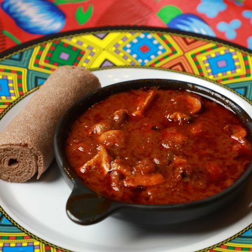 Beef cubes that are slowly cooked with Berbere (a fiery Ethiopian spice blend) and onions for a succulent sauce- like stew that’s rich in flavor.