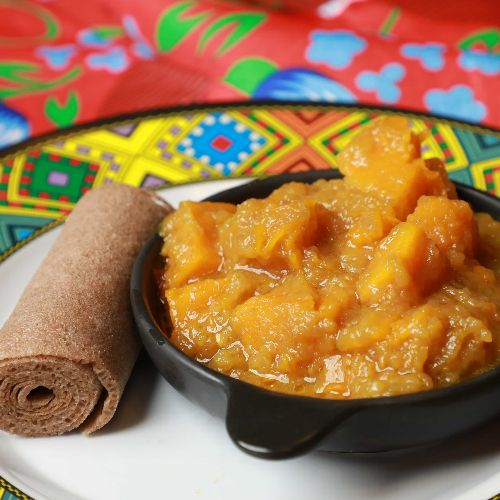 Pumpkin cubes sautéed with garlic and onions. Prepared with Berbere (a fiery Ethiopian spice blend) for the perfect flavor combination.