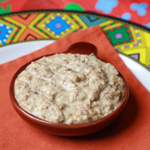 Crispy Injera spread with a mix of Berbere (a fiery Ethiopian spice blend) and olive oil, served with a dipping of Azifa (cooked brown lentils, chilled and blended with olive oil, mustard, onions, chopped chilli and freshly squeezed lemon) as well as blended spinach and mushrooms (prepared in tomatoes, olive oil, mustard, rosemary, herbs and spices for a unique Ethiopian taste).